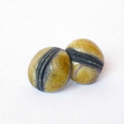 Petites boucles d'oreilles "puces" toutes rondes, jaunes et noires façonnées à la main et cuites selon la technique du 'Raku'.Diamètre : 2cm / épaisseur : 1cm