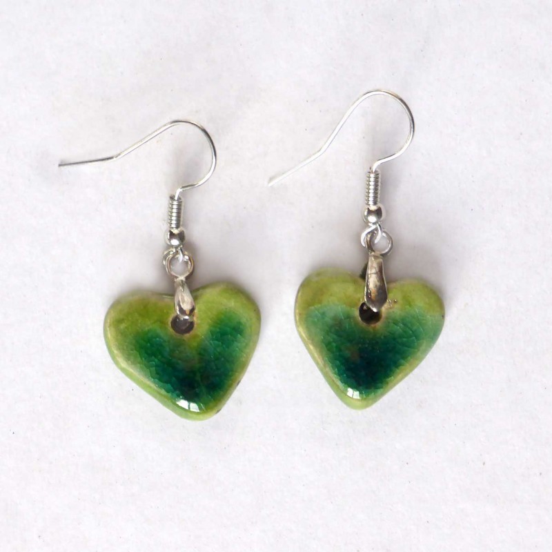 Boucles d'oreilles céramique vertes toutes fines et légères en forme de petits cœurs, façonnées à la main et cuites selon la technique du 'Raku'. Montées sur crochets couleur argent (sans nickel). Fournies avec petits embouts plastiques pour maintenir la boucle. Dimensions : 1,5cm x 1,5cm