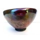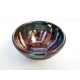 Création unique : petit bol à thé éclatant en céramique tourné et cuit selon la technique du raku avec, au centre, un petit point d'émail rouge. Les parties émaillées ont des teintes métalliques liées à l'enfumage. C'est aussi l'enfumage à la sortie du four qui donne le noir sur les parties sans émail.