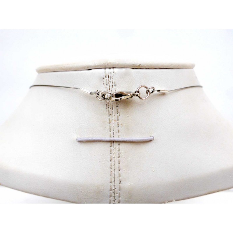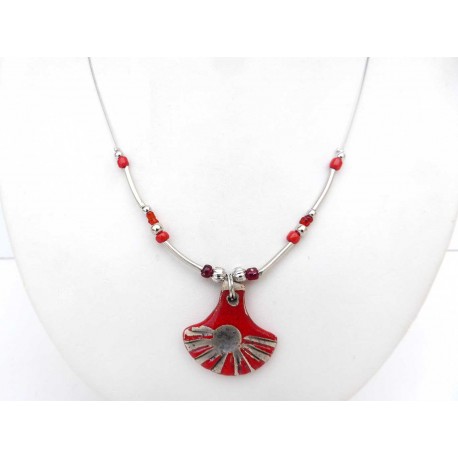 Collier tout léger composé d'un médaillon en forme d'éventail réalisé en céramique émaillé et cuit selon la technique du raku. Monté sur un câble souple très fin de couleur argent avec de petites perles en verre et métal argenté . Tour de cou d'un diamètre d'environ 14cm avec fermoir hameçon. Médaillon : 3cm x 3cm