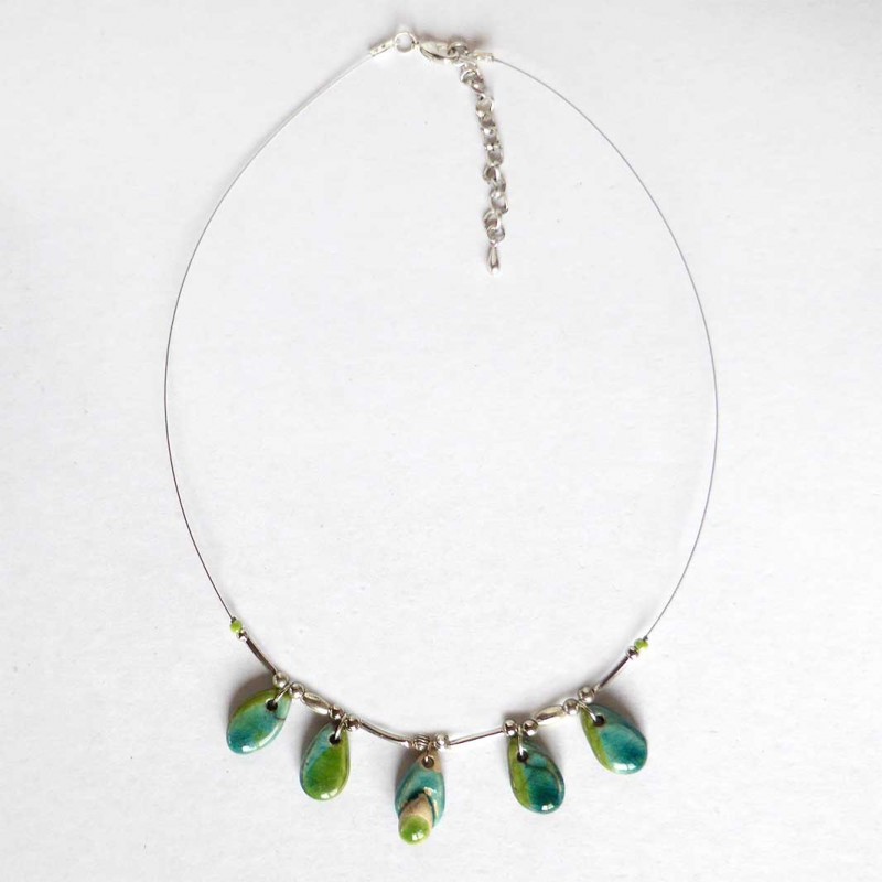 Collier tout fin et léger composé de cinq petits médaillons ovales en céramique émaillée en vert et turquoise cuits selon la technique du raku et de petites perles en verre et métal argenté. Monté sur câble souple très fin de couleur argent avec avec fermoir hameçon et chaînette de réglage. Les gouttes en céramique mesurent 2cm x 1cm.
