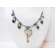 Collier de fête, raffiné et élégant composé de perles en céramique plates émaillées en blanc avec une touche de bleu turquoise et de perles en verre et métal argenté. Les perles en céramique sont toutes façonnées une à une, décorées puis émaillées et cuites selon la technique du raku Le tout est monté sur un câble souple très fin de couleur argent : tour de cou d'un diamètre d'environ 14cm avec fermoir et chainette de réglage pour allonger le collier. La perle céramique centrale mesure 3cm. Porté il mesure entre 21 et 23cm