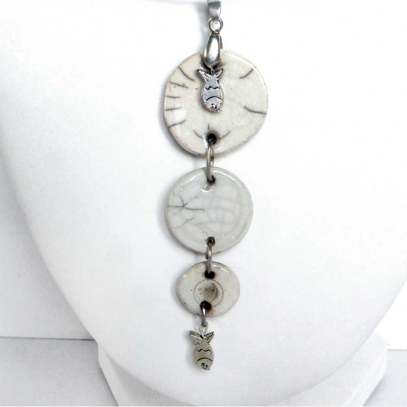Collier chic et léger composé de 3 médaillons ronds et plats en dégradé réalisés en céramique, émaillés en blanc et cuits selon la technique du raku. Joli craquelé lié à l'enfumage à la sortie du four. Sur le premier médaillon, en décor, une petite perle en métal argenté en forme de petit poisson. Le collier est monté sur large câble (14,5 cm) souple, fin et argenté avec fermeture à vis. Dimensions des médaillons : 3cm, 2,8cm et 1,8cm.