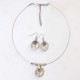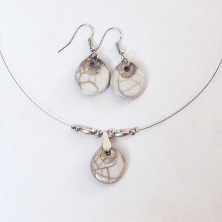Parure toute en rondeur, délicate, fine, élégante et légère en raku au joli craquelé du à l'enfumage. Elle est composée d'une paire de petites boucles d'oreilles et d'un collier réglable monté sur un câble souple très fin de couleur argent avec de petites perles en métal argenté. Le médaillon et les boucles d'oreilles mesurent environ 1,5cm de diamètre.
